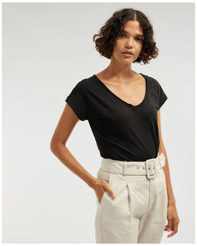 Amelius Sadie V Neck Tee - Black is your ultimate wardrobe staple, combining style and comfort for everyday Australian life. This effortlessly chic tee features a flattering V-neck design crafted from soft, high-quality cotton, making it perfect for layering or wearing solo. Whether you're dressing up for a casual outing or lounging at home, this timeless black tee enhances your look while keeping you comfortable through all seasons. Enjoy the incredible value of this must-have essential!