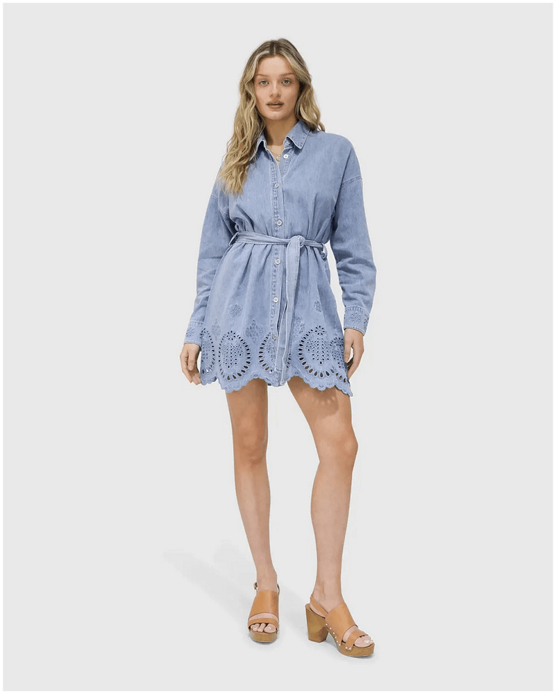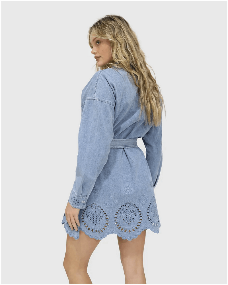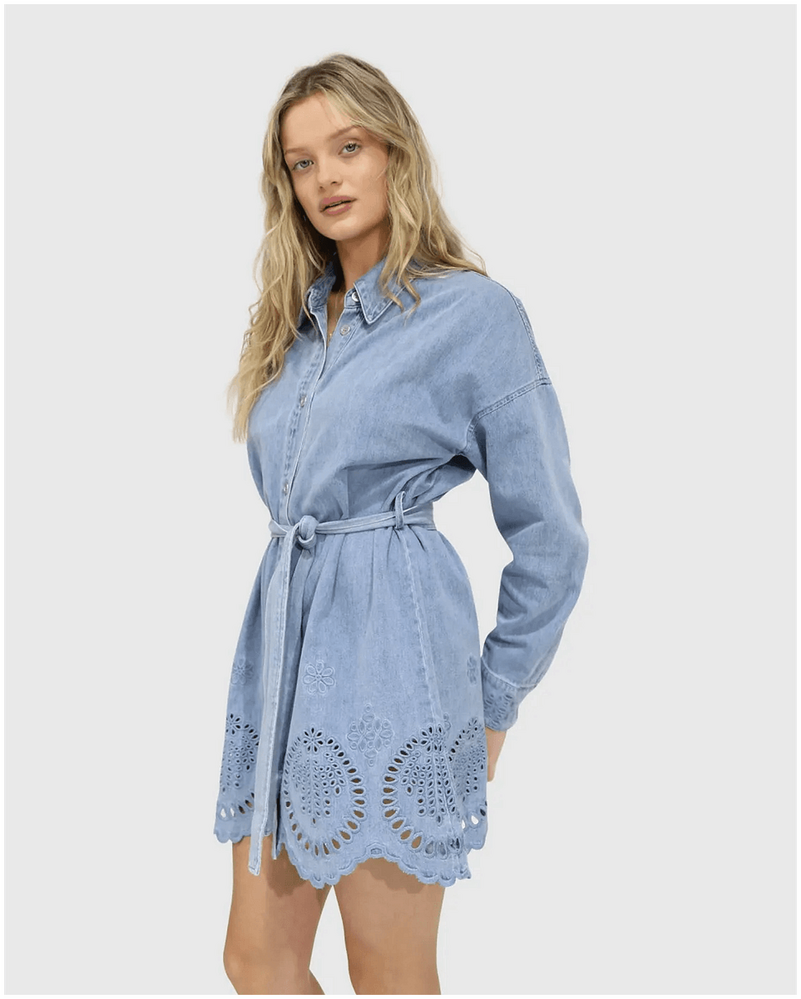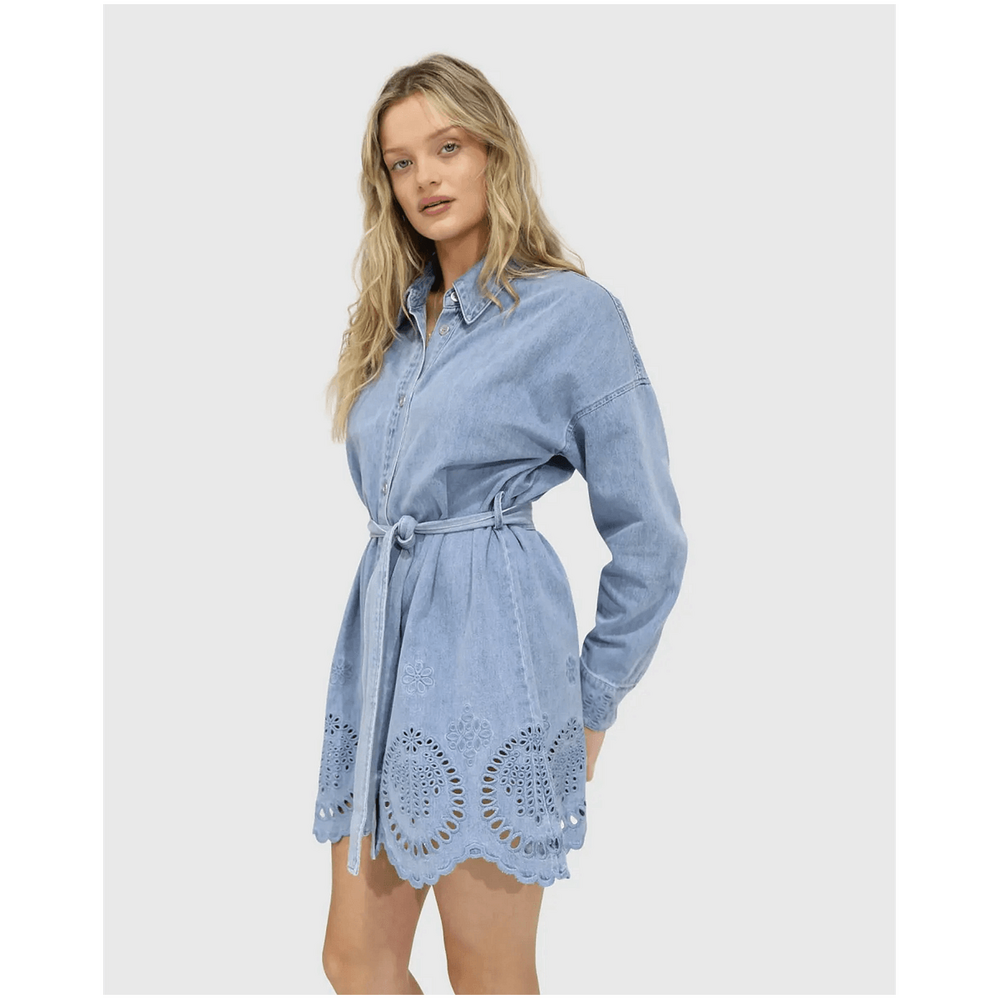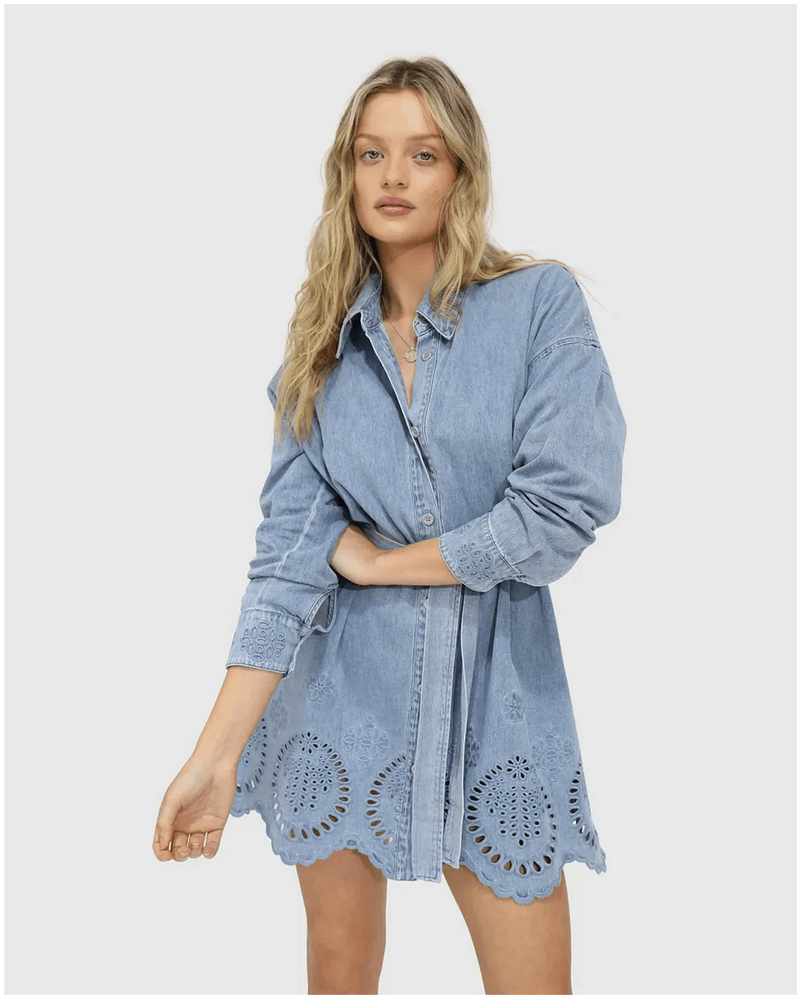 belle & bloom Sunday Somewhere Denim Broderie Mini Shirt Dress - Stonewash is the ultimate addition to every Australian wardrobe. This versatile denim shirt dress effortlessly combines chic style with everyday comfort, making it perfect for casual outings or dressy occasions. The intricate broderie detailing adds a unique touch, allowing you to express your personal style while feeling confident and comfortable. Whether you're heading to brunch or a night out, this dress has you covered for any event.