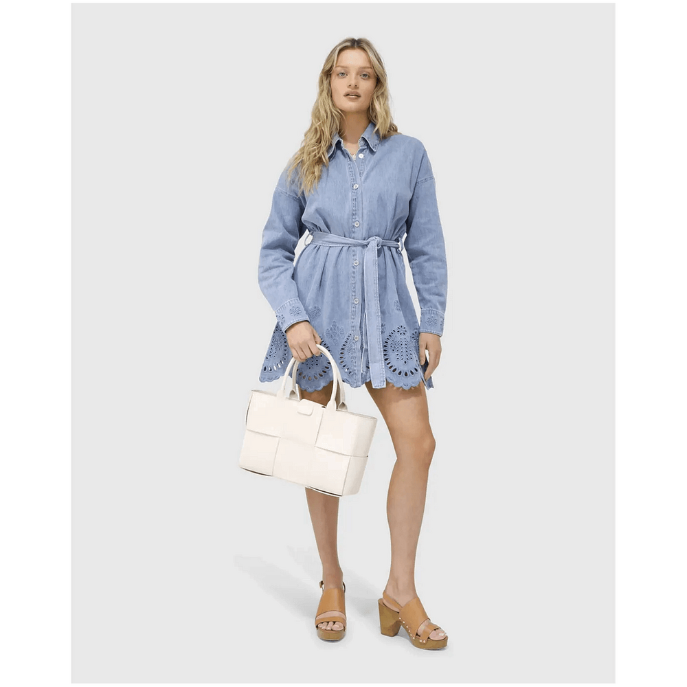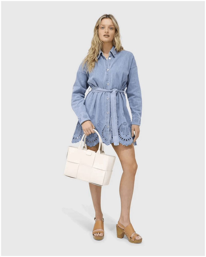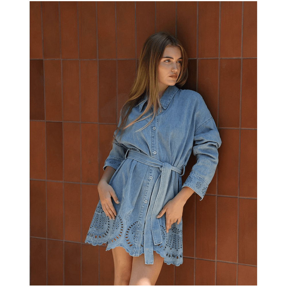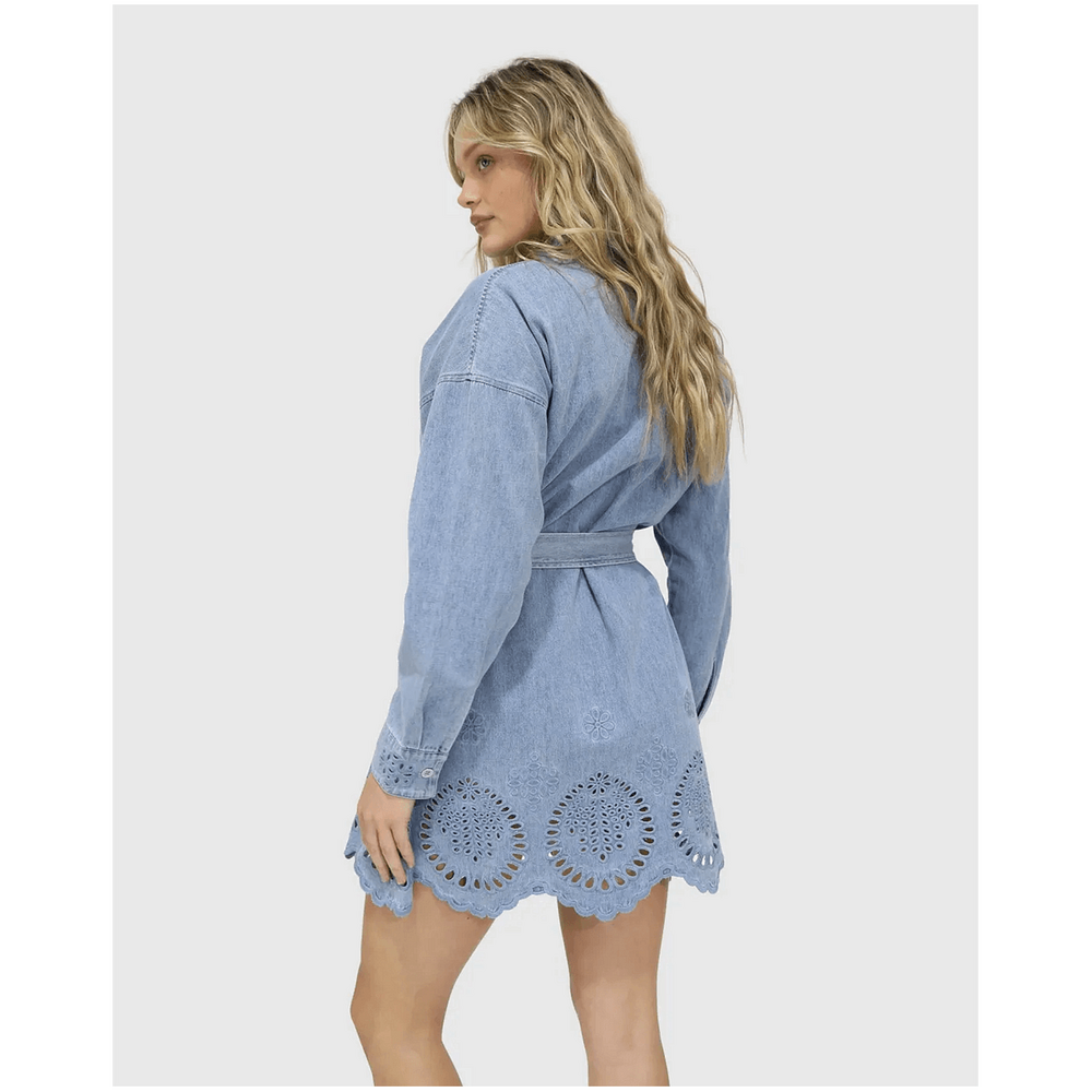 belle & bloom Sunday Somewhere Denim Broderie Mini Shirt Dress - Stonewash is the ultimate addition to every Australian wardrobe. This versatile denim shirt dress effortlessly combines chic style with everyday comfort, making it perfect for casual outings or dressy occasions. The intricate broderie detailing adds a unique touch, allowing you to express your personal style while feeling confident and comfortable. Whether you're heading to brunch or a night out, this dress has you covered for any event.