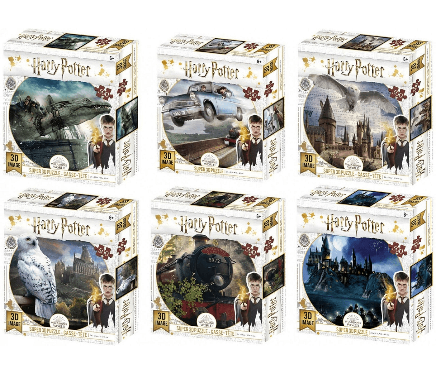 Includes six magical Crown & Andrews Super 3D 500pc Harry Potter puzzles. captivating imagery, immersive experience, perfect collectible gift.
