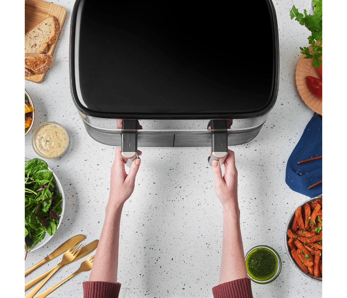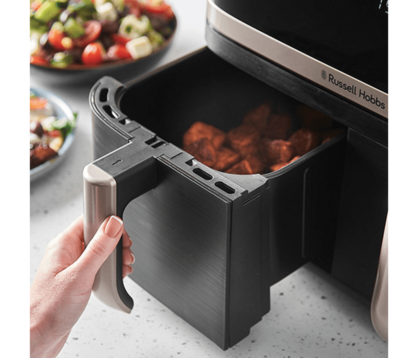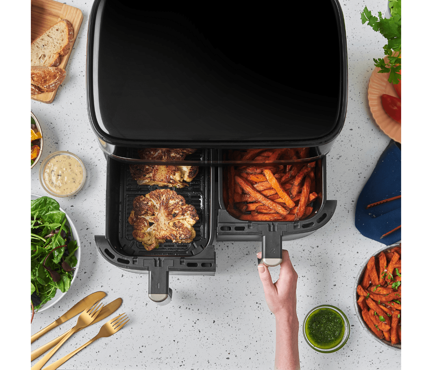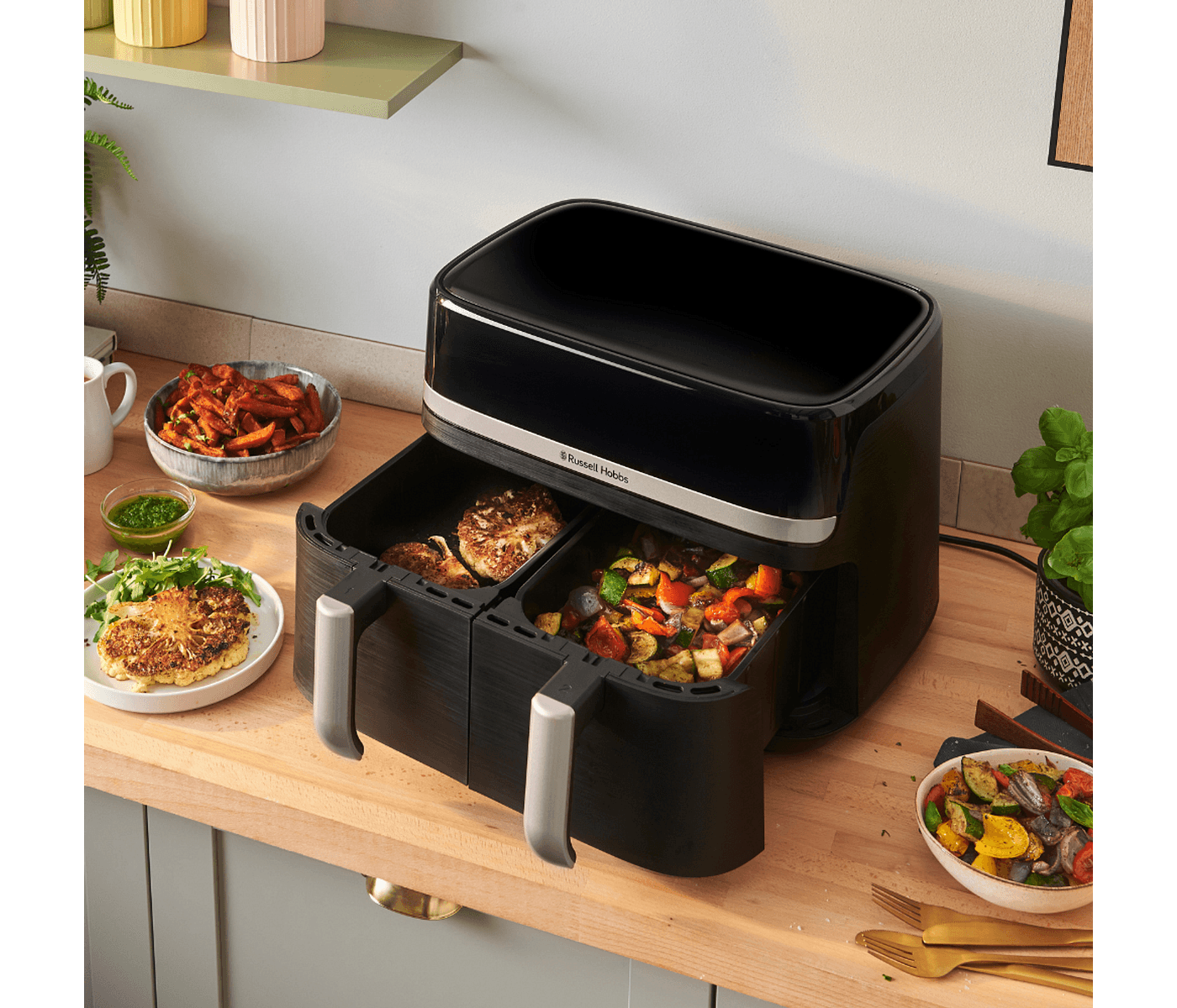 • Dual basket design for efficient meal prep